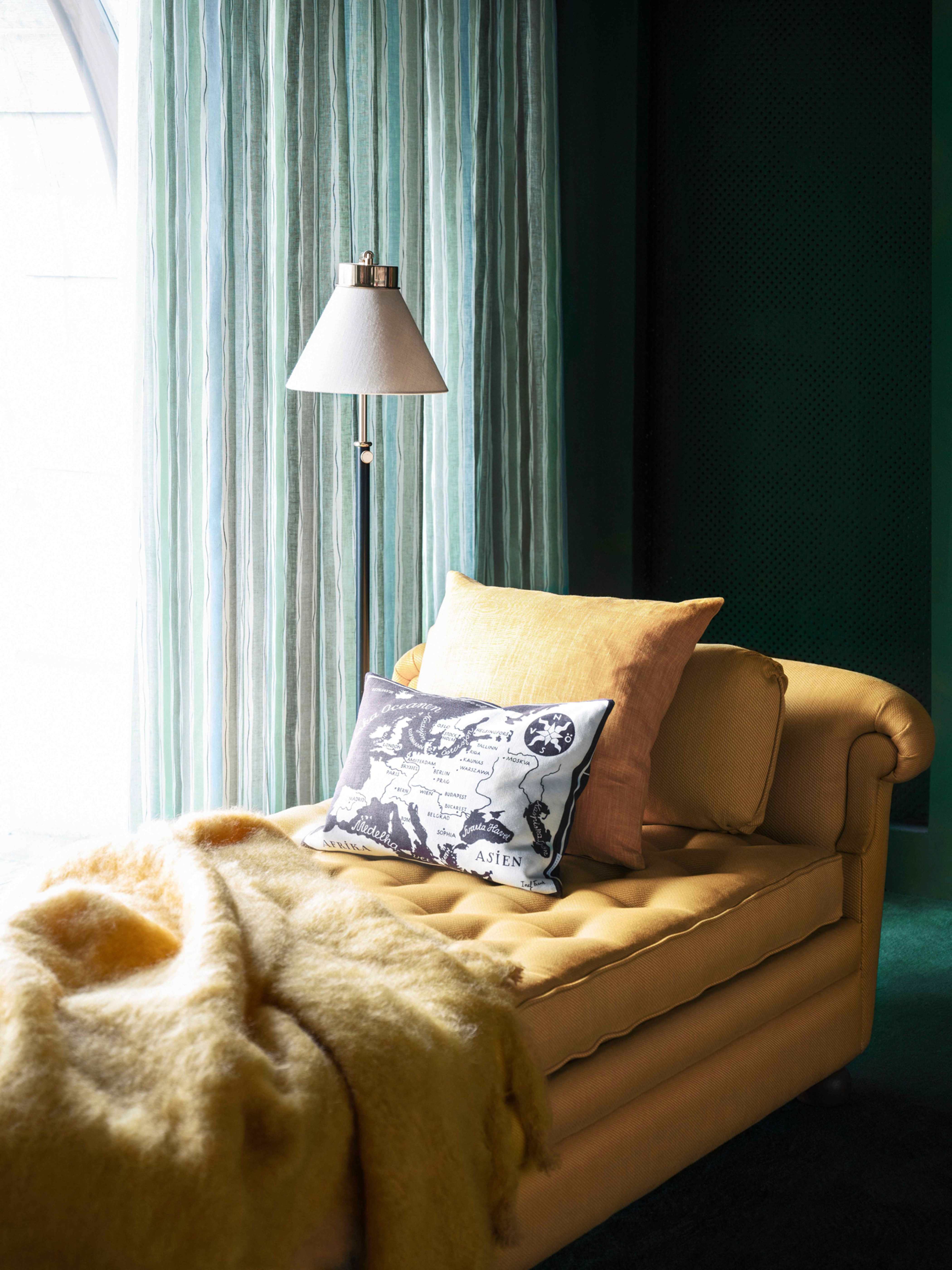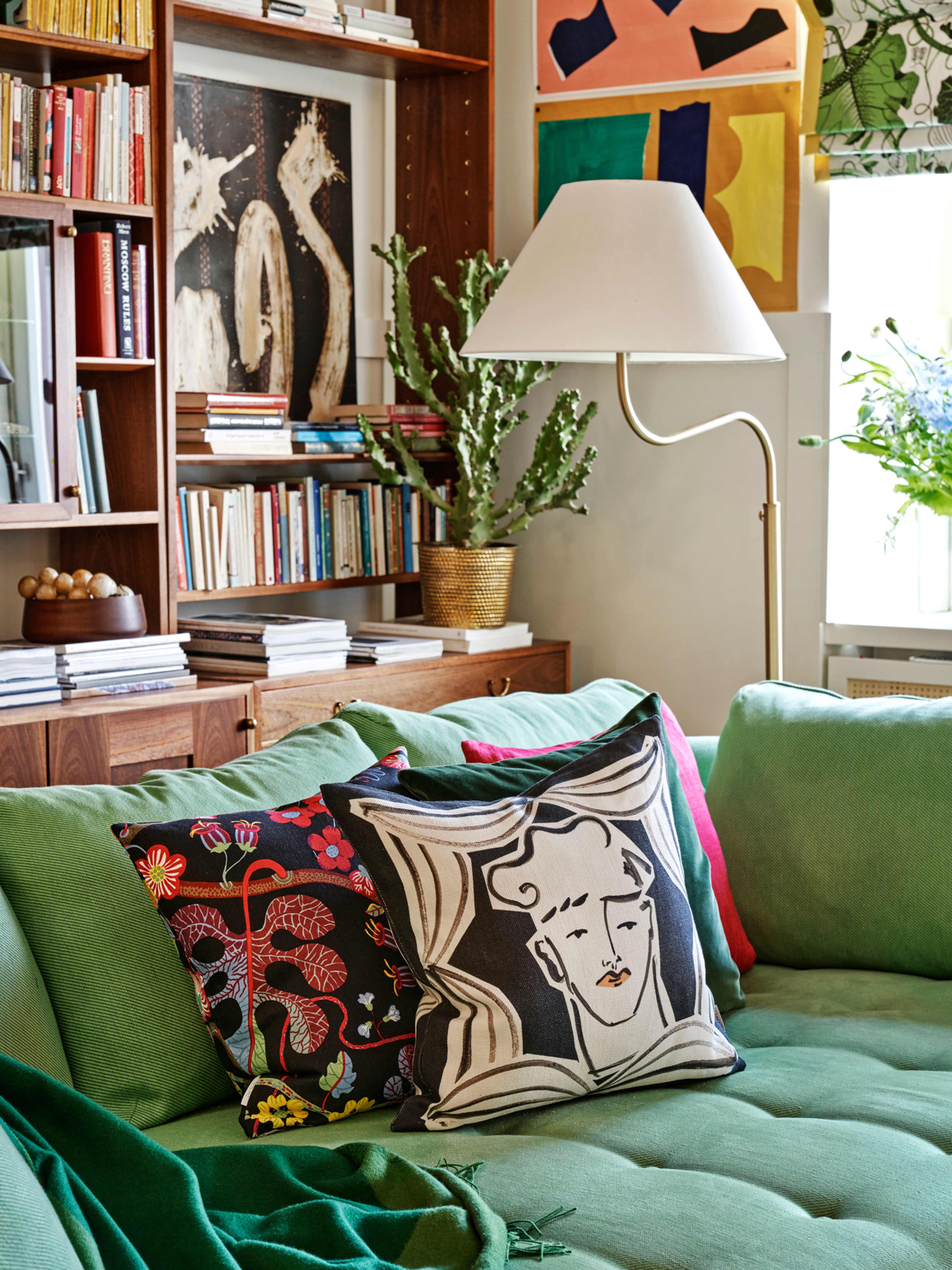 En kudde i Josef Frank-tyg adderar färg till vardagsrummet, och går att kombinera på en mängd olika sätt. Arrangera prydnadskuddarna på ett personligt vis; gammalt och nytt blir vackert ihop, och likaså blir runda kuddar kombinerade med en klassisk rektangulär kudde eller en kudde i kvadratisk form. Interiörer där färger och mönster blandas upp blir ofta både spännande och inspirerande, och en kudde är ett riktigt bra och enkelt exempel på hur små ändringar kan göra stor skillnad för hela känslan i ett rum.